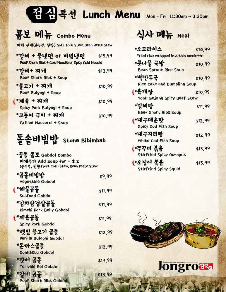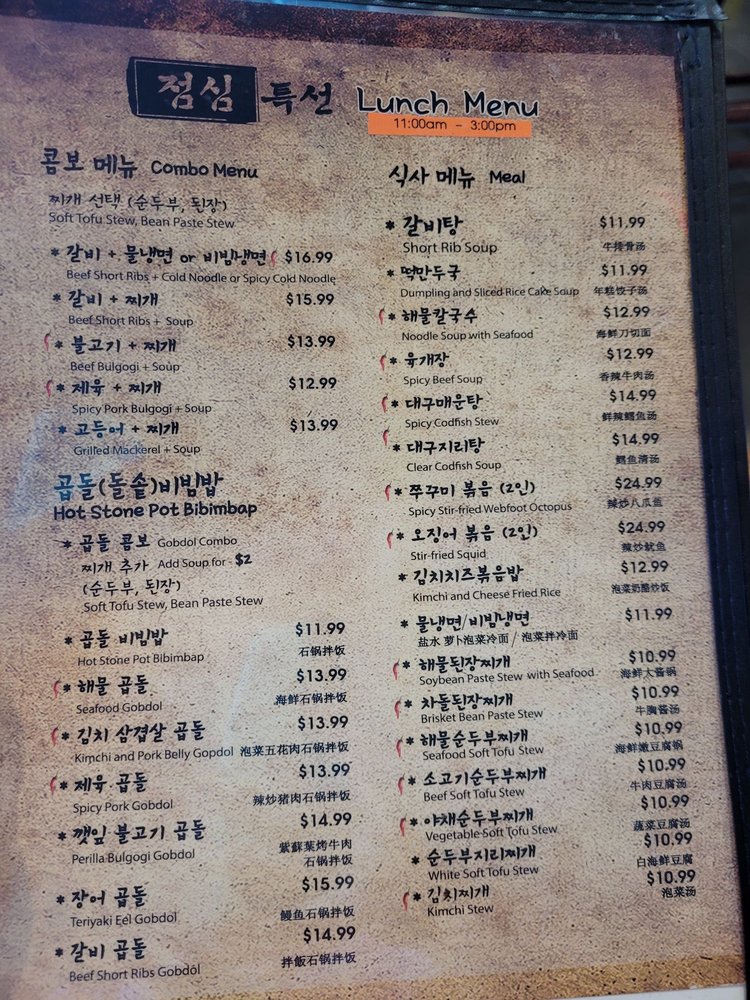 Introducing the menu at Jongro BBQ Flushing, located in Flushing, NY. This restaurant offers a variety of lunch meals and combos, including options like Pork Cutlet, Noodle Soup with Seafood, and Kimchi Cheese Fried Rice. For those looking for a lunch combo, try the Beef Short Ribs with Cold Noodles or the Spicy Pork Bulgogi with Soup. Gobdol combos are also available, featuring dishes like Vegetable Gobdol and Beef Short Ribs Gobdol. Customers rave about the tender and perfectly cooked meat, unlimited sides, and fantastic marinated galbi. The service may vary based on busyness, but the food quality and atmosphere receive high praise. Experience delicious Korean BBQ and enjoy a comfortable dining experience at Jongro BBQ Flushing.
